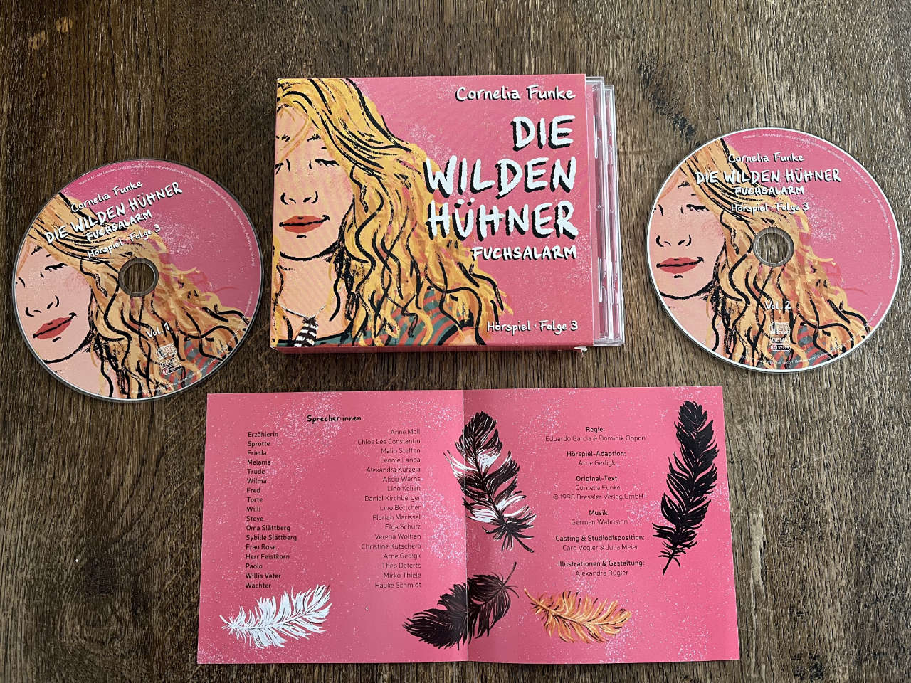 3 CDs im liebevoll gestalteten Schuber: 2 x Hörspiel-CD plus Musik-CD oder als Download und Stream auf der Plattform deiner Wahl Hörspiel Folge 1: ca. 89 Minuten Die Wilden Hühner Hits: ca. 19 Minuten Original-Text: Cornelia Funke © 1993 Dressler Verlag GmbH Hörspiel: Mit den Stimmen von: Anne Moll (Erzählerin), Chloe Lee Constantin, Malin Steffen, Leonie Landa, Alexandra Kurzeja, Alicia Warns, Lino Kelian, Daniel Kirchberger, Lino Böttcher, Florian Marissal, Elga Schütz, Verena Wolfien, Christine Kutschera, Martin Sabel, Jan Hasenfuß Sänger:Innen: Antje Schomaker, Lina Maly, Fidi Steinbeck, Ebow, Alexandra Kurzeja, Malin Steffen & Lino Böttcher Hörspiel-Adaption: Arne Gedigk Regie: Eduardo García & Dominik Oppon Musik: German Wahnsinn Produziert & eingespielt vom German Wahnsinn Team: Eduardo García, Philipp Feit, Ralf Lippmann, Steffen Lohrey, Moritz P.G. Katz, Nicolai Kopka, Arne Gedigk & Ben Funke Mastering: Chris von Rautenkranz im Soundgarden Tonstudio Casting & Disposition: Caro Vogler & Julia Meier Studiomanagement: Julia Meier, Rabea Debus & Simon Grund Musikverlag: Chemusic & Ecopark Studio e.K. Illustrationen & Gestaltung: Alexandra Rügler