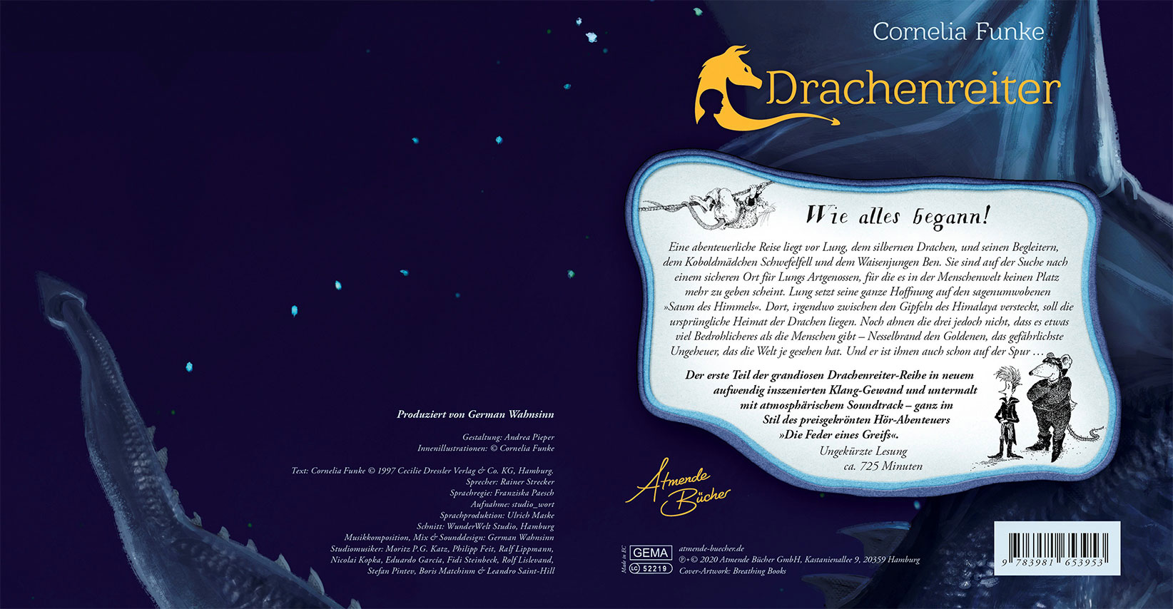 Von den schottischen Highlands über das Rote Meer bis hin zu den steinigen Bergen des Himalaya: Rainer Strecker entführt uns in die fantastische Welt des Drachenreiter und leiht seine Stimme erstmalig den Figuren Lung, Ben, Barnabas & Co. Vor einer mysthisch-verträumten Klangkulisse nimmt uns der Schauspieler und Sprecher auf eine abenteuerliche Reise für die Ohren mit und wechselt spielerisch vom bedrohlichen Ungeheuer Nesselbrand zur säuselnden Seeschlange.